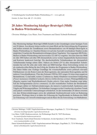 Anlässlich des 20-jährigen Bestehens des "Monitorings häufiger Brutvögel" in Deutschland und Baden-Württemberg stellen wir erstmals die aktuellen Trendklassen und Bestandsindizes zu 40 statistisch belastbaren, häufigen Brutvogelarten auf Landesebene vor. Darüber hinaus werfen wir einen Blick auf die Entwicklung des Programms, beleuchten herausragende Abweichungen zu den bundesweiten Trends und betrachten die Ergebnisse nach ökologischen Gilden. Zudem beschreiben wir eine Auswahl wichtiger Umweltveränderungen in Baden-Württemberg, die als Ursache bestimmter Trends in Frage kommen und zeigen den Bedarf nach weiterführender Forschung auf.